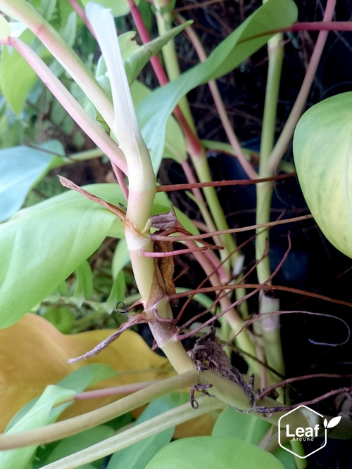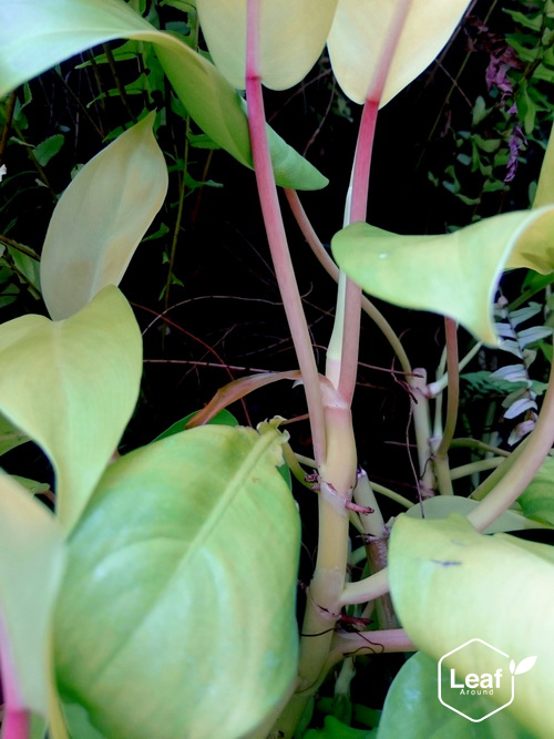 อีกจุดที่น่าสังเกตคือก้านใบ โดยก้านใบของฟิโลทองจะมีสีอมชมพู ในขณะที่กิ่งก้านของราชินีสีทองจะเป็นสีเขียวถึงสีเขียวอ่อนอมเหลือง มักมีขีดตามยาวสีเหลือง หรือสีขาว โดยเมื่อแก่จะมีเนื้อไม้