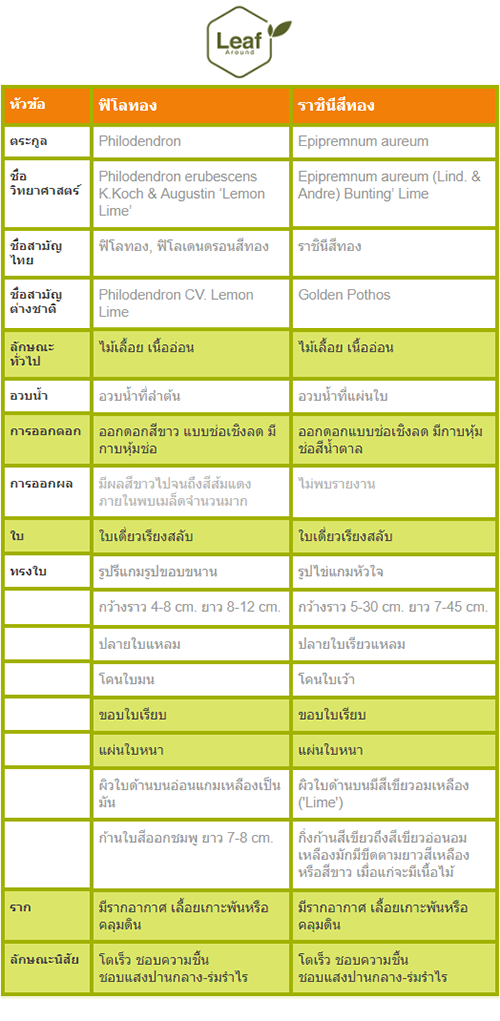 สรุปจุดแตกต่างที่จะช่วยในการแยกต้นฟิโลทองและราชินีสีทองได้อย่างถูกต้อง