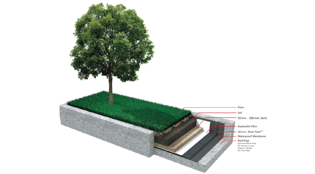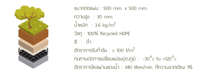 5. วัสดุ DRAIN PAVETM มีความหนา 3 ซม. ทำให้สามารถช่วยลดความหนาของชั้นระบายน้ำลงได้ และเพิ่มความหนาในส่วนของชั้นดิน ซึ่งทำให้สามารถปลูกต้นไม้ได้ใหญ่ขึ้น