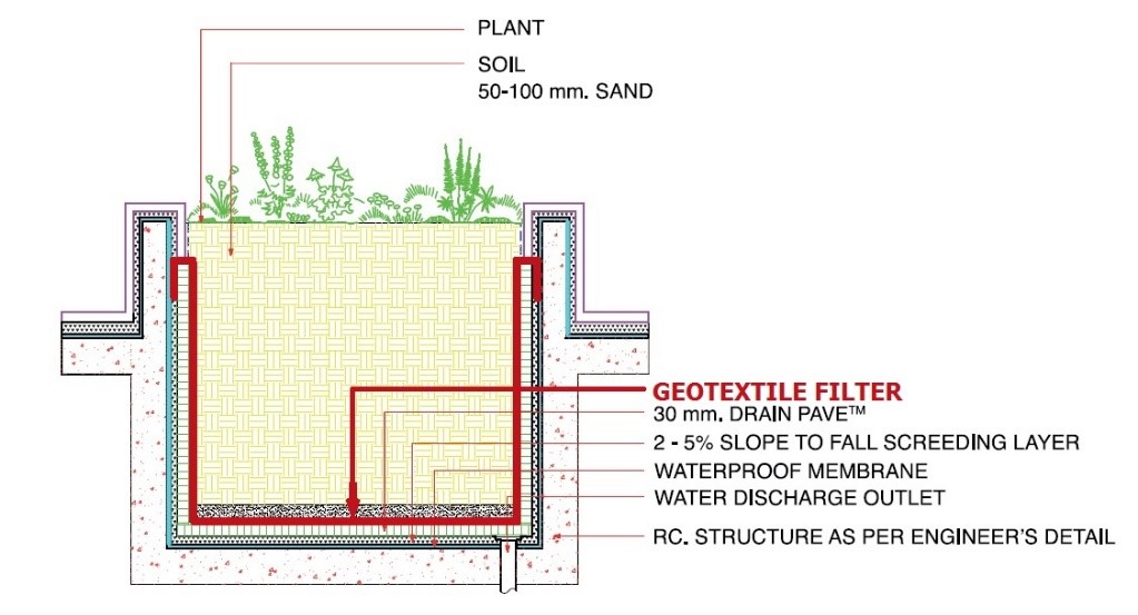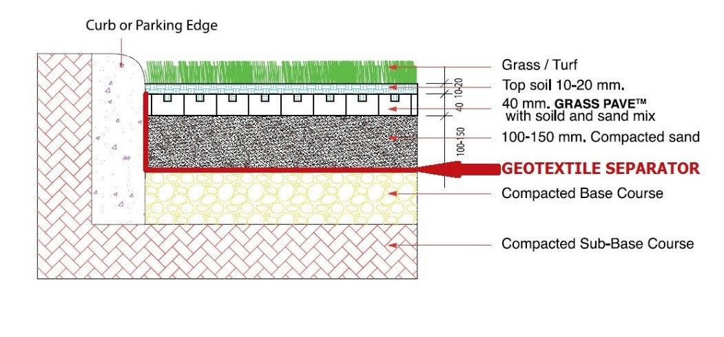 จะใช้ปูกรองวัสดุเพื่อการระบายน้ำ โดยทำการปูแผ่นใยสังเคราะห์ลงบนพื้นผิว และวางทับกัน(Overlap)ในช่วงรอยต่อระหว่างแผ่นประมาณ10-15 ซม.